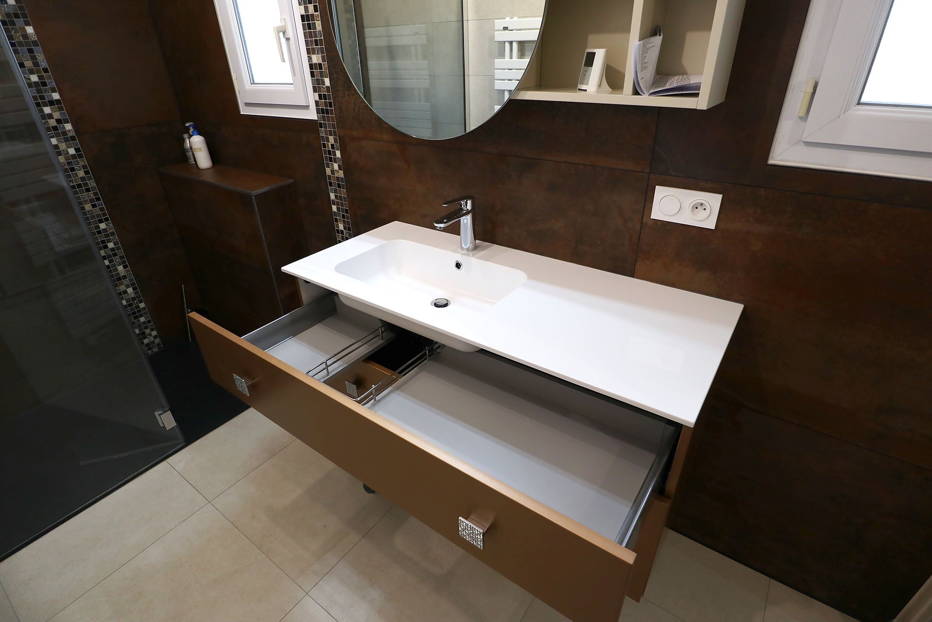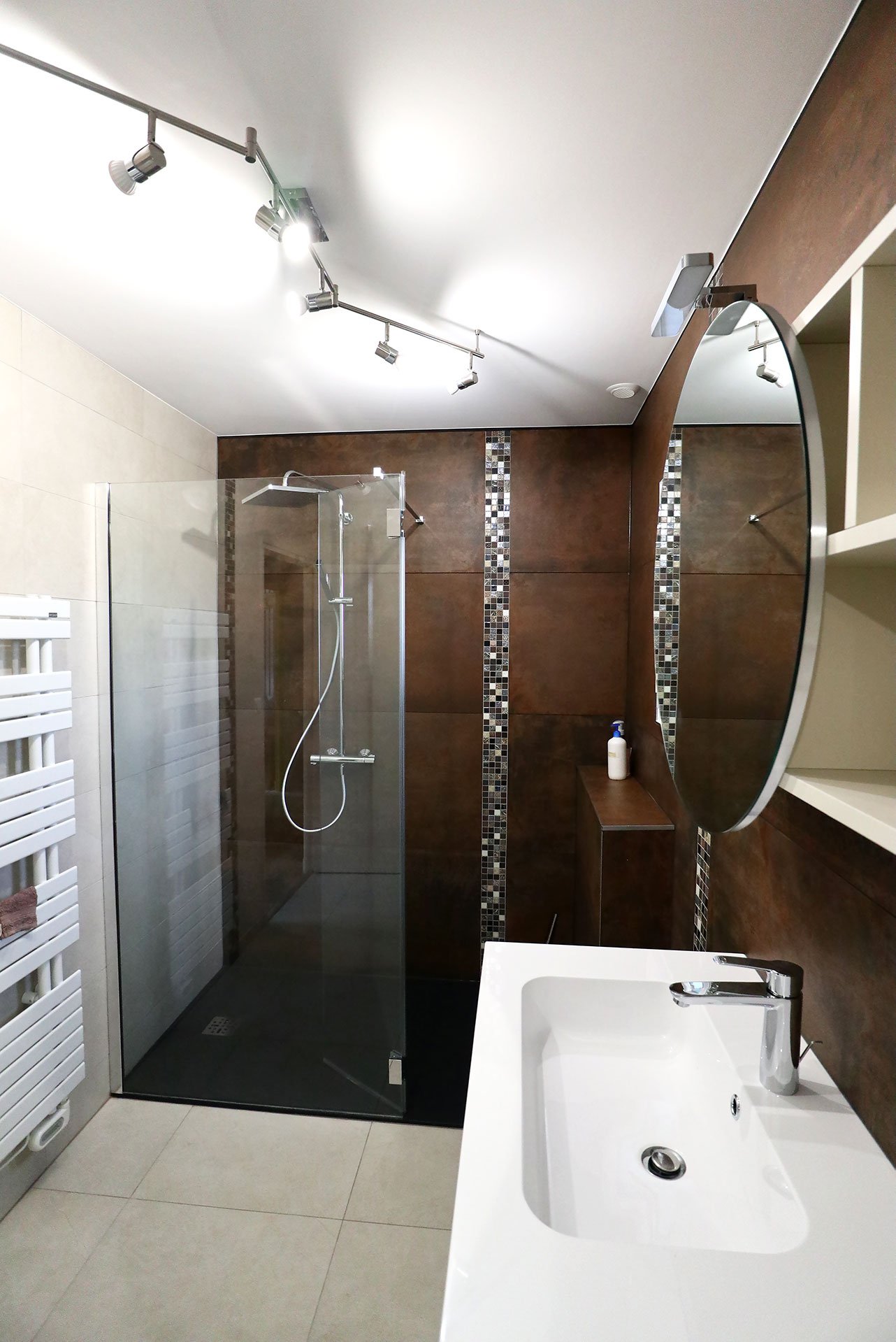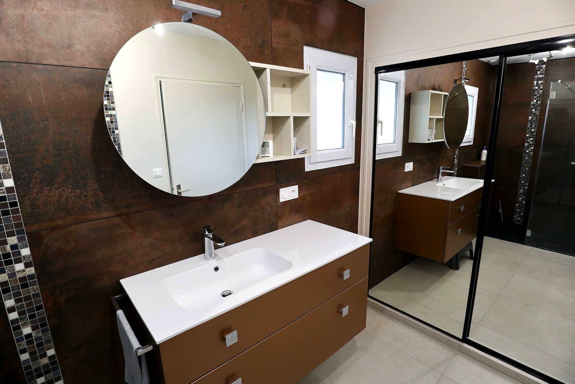 Des dalles de faïence XXL en métal oxydé brun très chic viennent orner cette salle de bains, une matière mise en valeur par un sol clair qui respecte la lumière naturelle. On aime les frises verticales mosaïques patchwork qui décorent de temps à autre les murs et le meubles aux façades laquées cuivre métallisé.