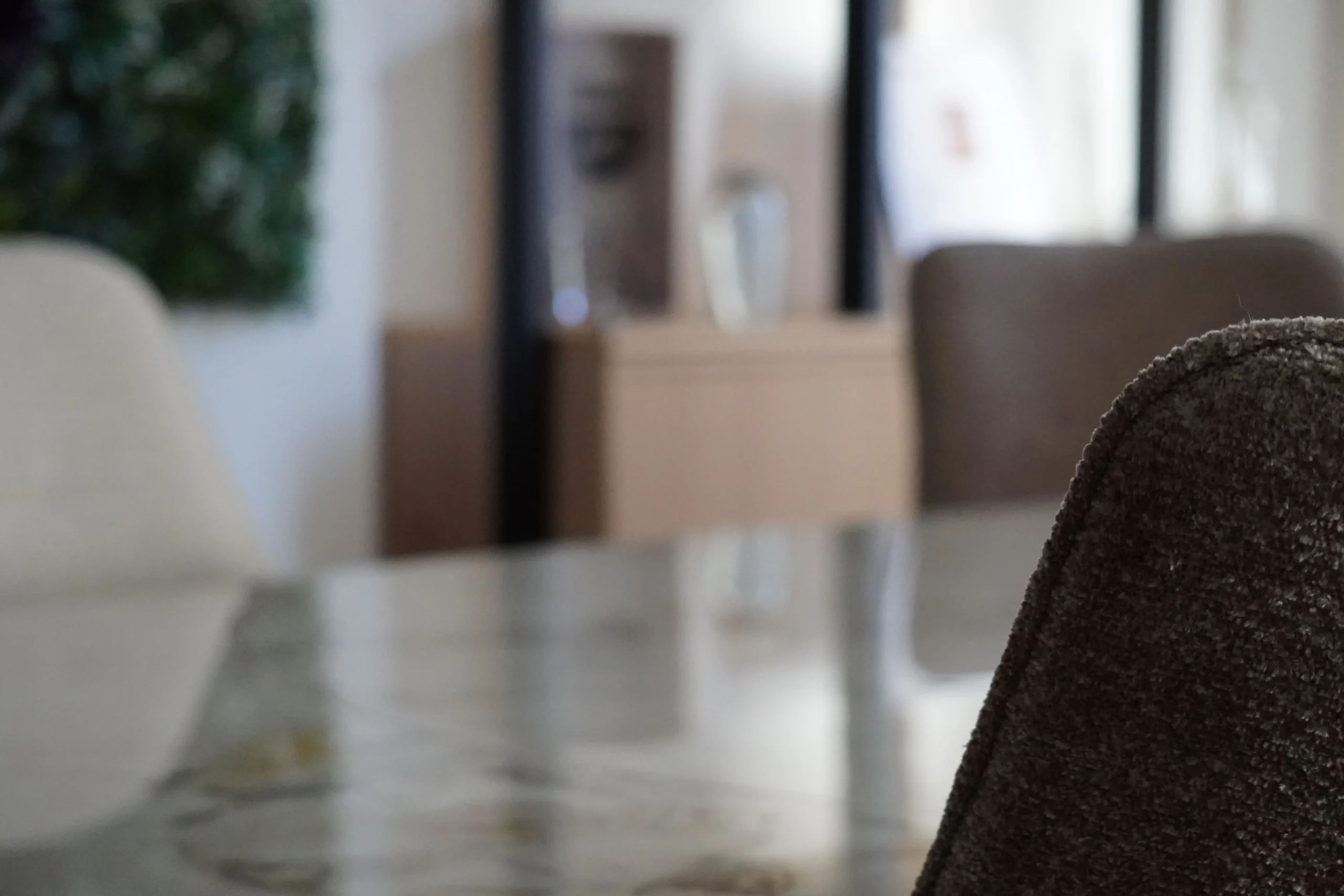 Ce salon se distingue par une ambiance élégante et contemporaine, où les matières nobles et les contrastes de couleurs créent un ensemble harmonieux et raffiné. La table à manger en marbre blanc attire immédiatement le regard grâce à sa luminosité et à son aspect sophistiqué. Elle apporte une touche de légèreté visuelle qui équilibre parfaitement les éléments plus sombres de la pièce.