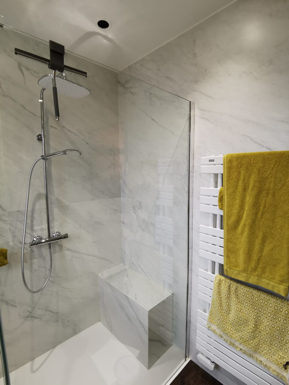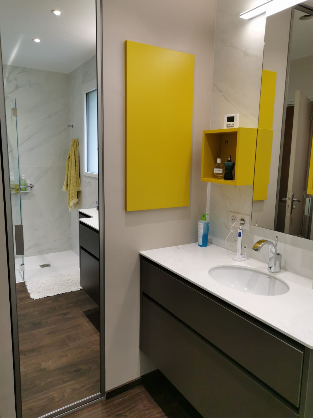 À la fois esthétique et fonctionnelle, cette salle de bain offre un cadre contemporain, idéal pour un espace à la fois pratique et raffiné.